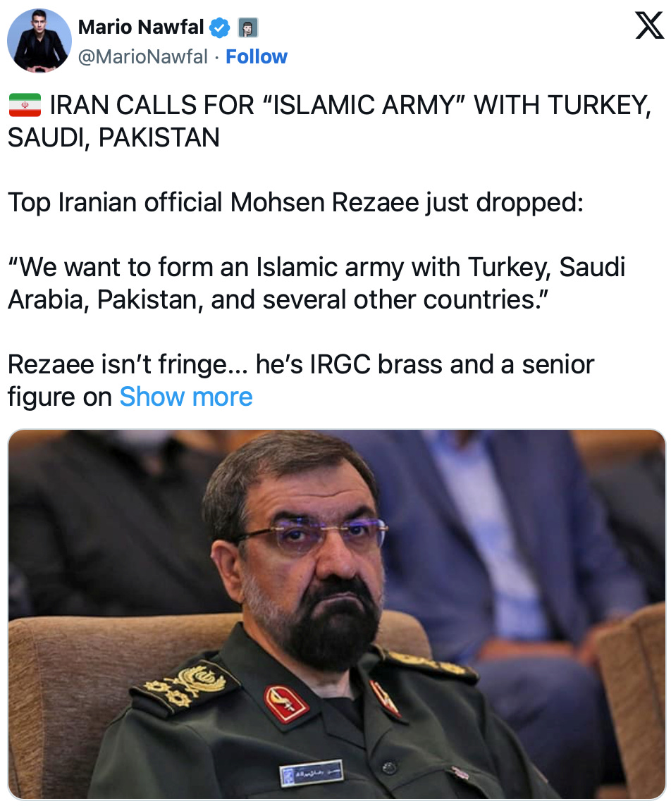 That seems unlikely at this stage, but one Iranian official is calling for Turkey, Saudi Arabia and Pakistan to form a giant “Islamic army” to confront Israel…