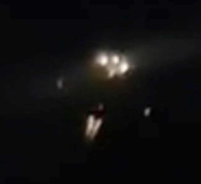 One drone, heard roaring in the skies as it moved through the darkness, appeared to have a cluster of white lights on its underbelly and red lights blinking at the tips of its wings and tail.