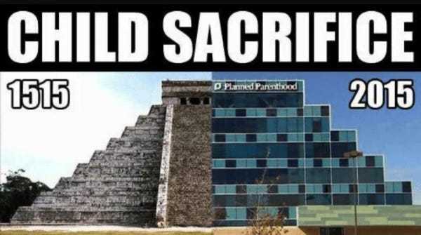 In this one, Planned Parenthood’s facility in Houston is placed next to an ancient Aztec pyramid where children would be sacrificed 500 years ago…