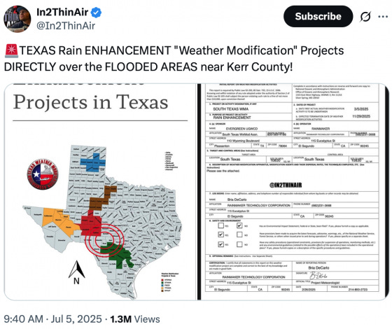 Many on social media are pointing out that “rain enhancement projects” have recently been conducted in Texas. Needless to say, we need answers from those that were involved in those projects.