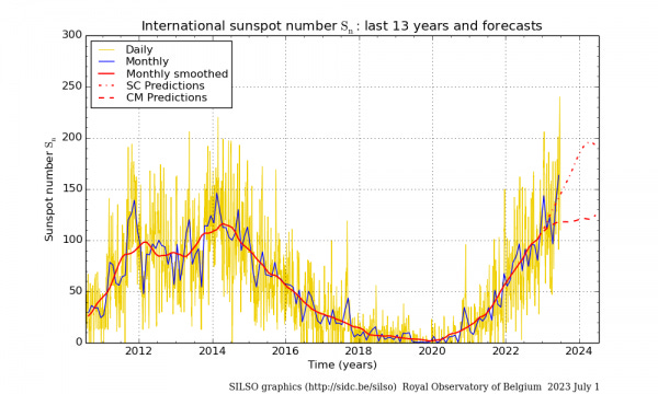 In recent months, sunspot activity has been rising at an exponential rate. The following chart comes from the Royal Observatory of Belgium’s Solar Influences Data Analysis Center…