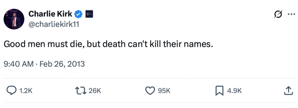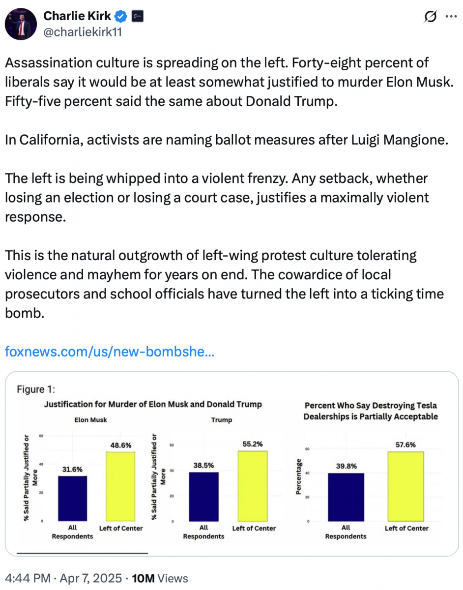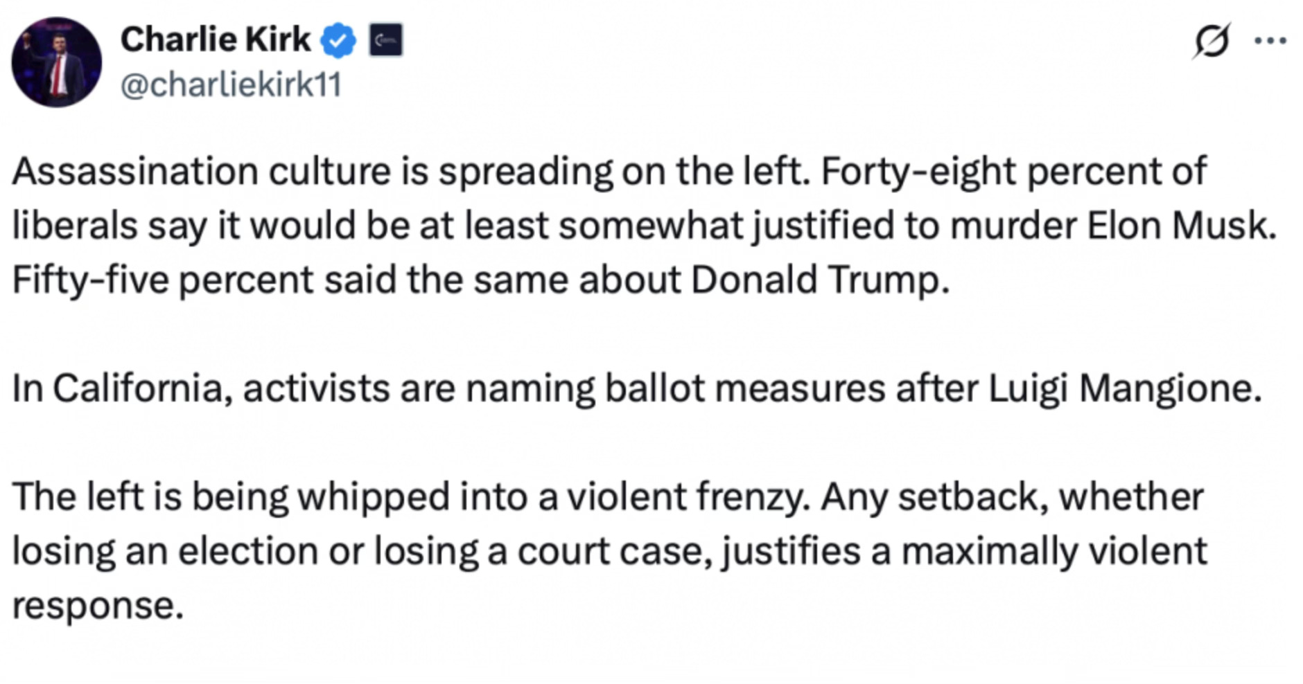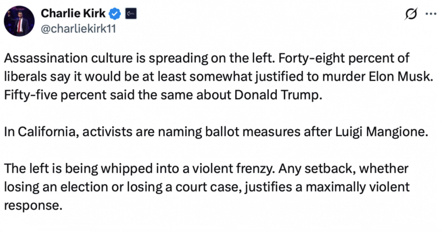 On April 7th of this year, Charlie Kirk drove this point home in a tweet in which he warned that “assassination culture is spreading on the left”…