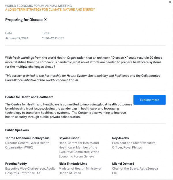 The description for the discussion reads: “With fresh warnings from the World Health Organization that an unknown ‘Disease X’ could result in 20 times more fatalities than the coronavirus pandemic, what novel efforts are needed to prepare healthcare systems for the multiple challenges ahead?”